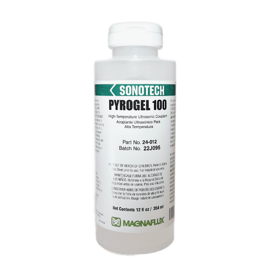 A thick gel wide temperature range couplant for thickness gauging, flow metering, acoustic emissions testing and flaw detection/sizing at -50 to 805°F / -45 to 429°C. Pyrogel is a broad temperature range couplant for thickness gauging, flow metering, acoustic emissions testing and flaw detection/sizing. These products contain no polymers and resists drying, making them an excellent choice for long term flow metering applications.