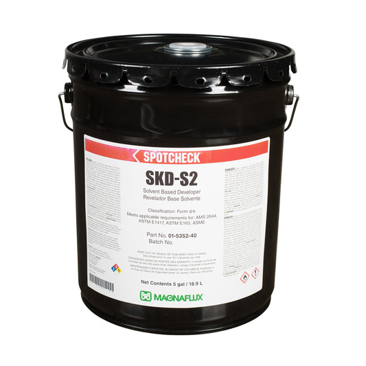 A bright white, non-aqueous developer, Magnaflux SKD-S2 creates an opaque white background for high-contrast visible dye penetrant testing and quickly draws penetrant out to create stronger, clearer indications for better inspection reliability and sensitivity. SKD-S2 helps speed up the inspection process by going on easily, drying quickly, promoting faster indication formation and minimizing post-inspection cleaning.